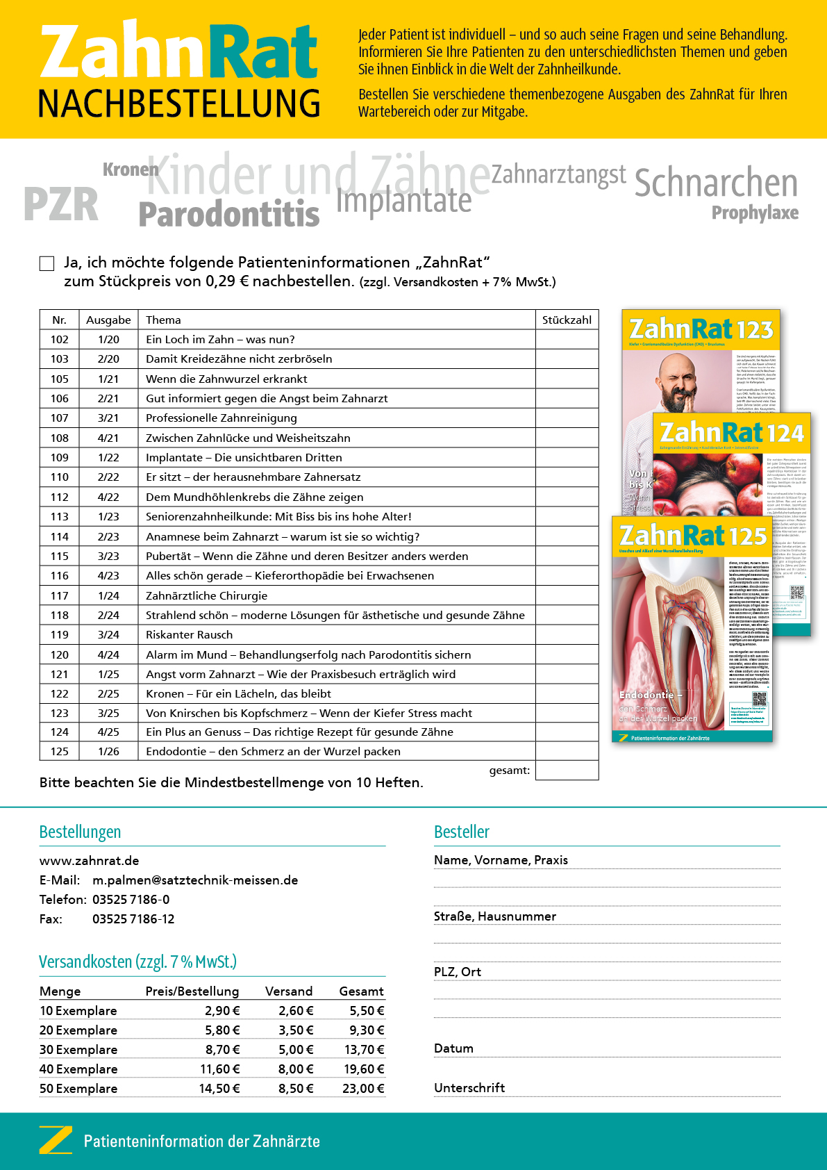 Nachfolgend haben Sie die Möglichkeit, einzelne Ausgaben von ZahnRat direkt zu bestellen. Dazu geben Sie einfach die gewünschte Anzahl in das vorbereitete Formular ein. Der Versand erfolgt umgehend.